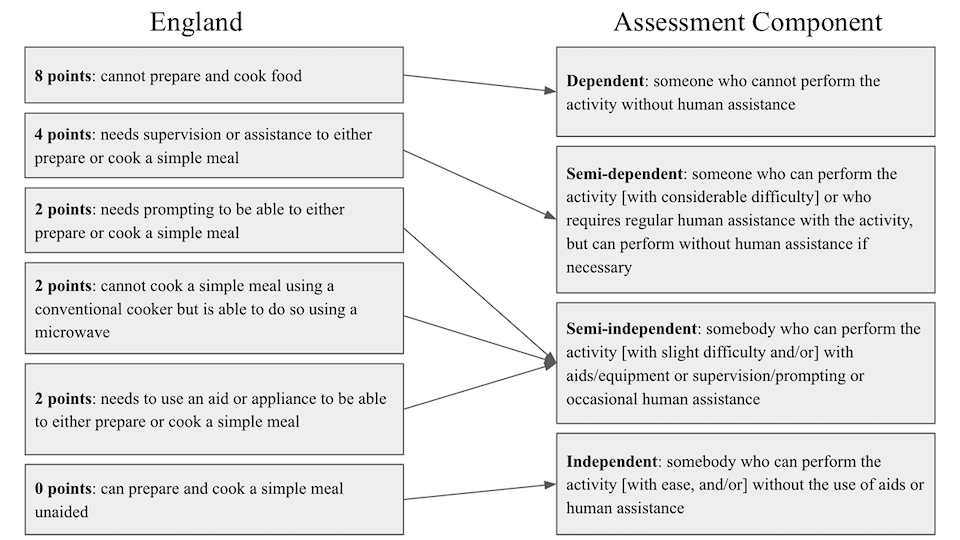 Figure 4 presents an example of the mapping for England's Cash Benefit care needs assessment, which uses a point-based scoring system. For the sub-activity of overall preparing food, each assessment criterion is assigned a point value that is then mapped onto the corresponding impairment level as defined in the assessment component. For example, an individual unable to prepare and cook food without assistance (8 points in England) is classified as dependent on the assessment component scale, whereas someone who can prepare and cook a simple meal unaided (0 points in England) is classified as independent on the assessment component scale.