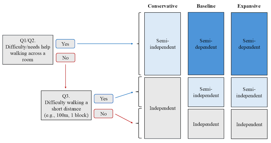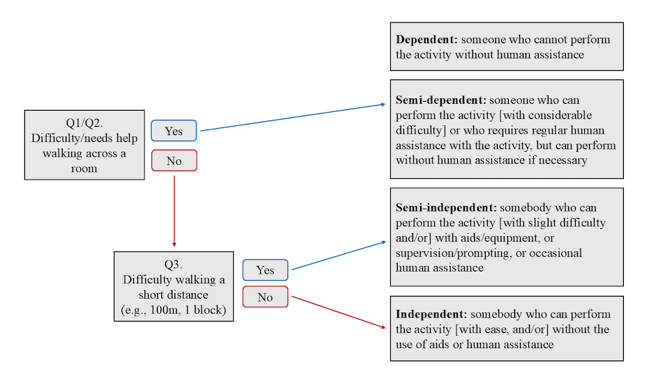 Survey variables are used to classify individuals into one of four levels of impairment: independent, semi-independent, semi-dependent, and dependent. Figure 2 illustrates this classification for overall walking.