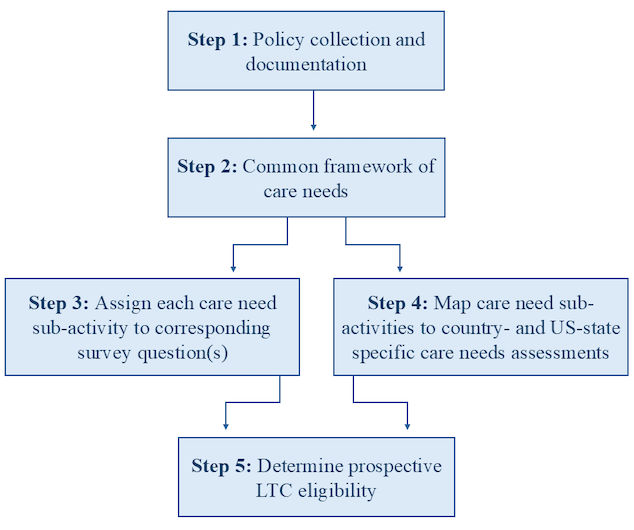 To develop these resources, the Gateway LTC team designed a five-step harmonization process (depicted in Figure 1) to systematically link LTC policy information with HRS-INS survey data in a consistent and comparable way across countries worldwide and US states: